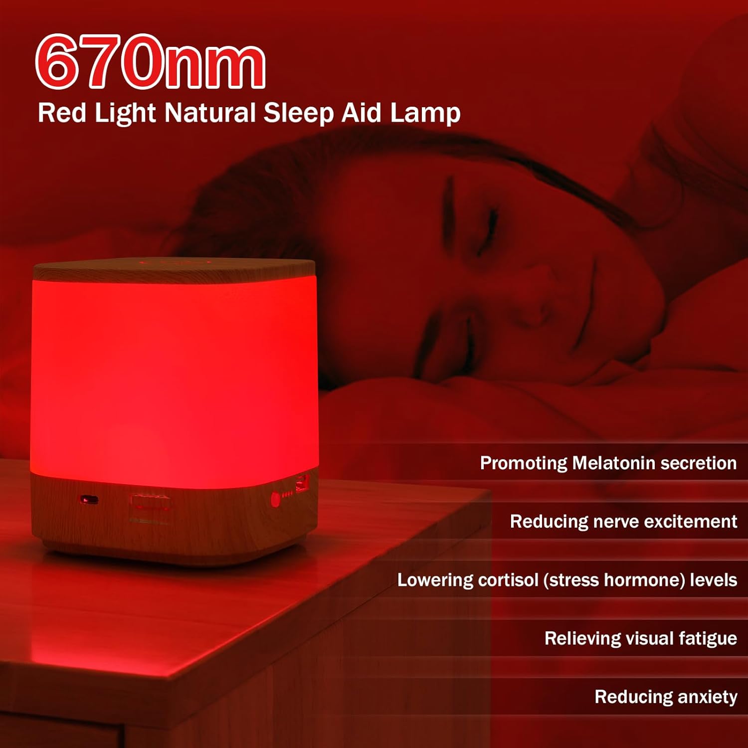 • Red Light Therapy for Sleep: 670nm wavelength red light simulates the warm red light at sunset, mainly by promoting melatonin secretion, blocking blue light, reducing nerve excitement, lowering cortisol (stress hormone) levels, relieving visual fatigue, creating a soothing environment, and reducing anxiety to improve sleep.