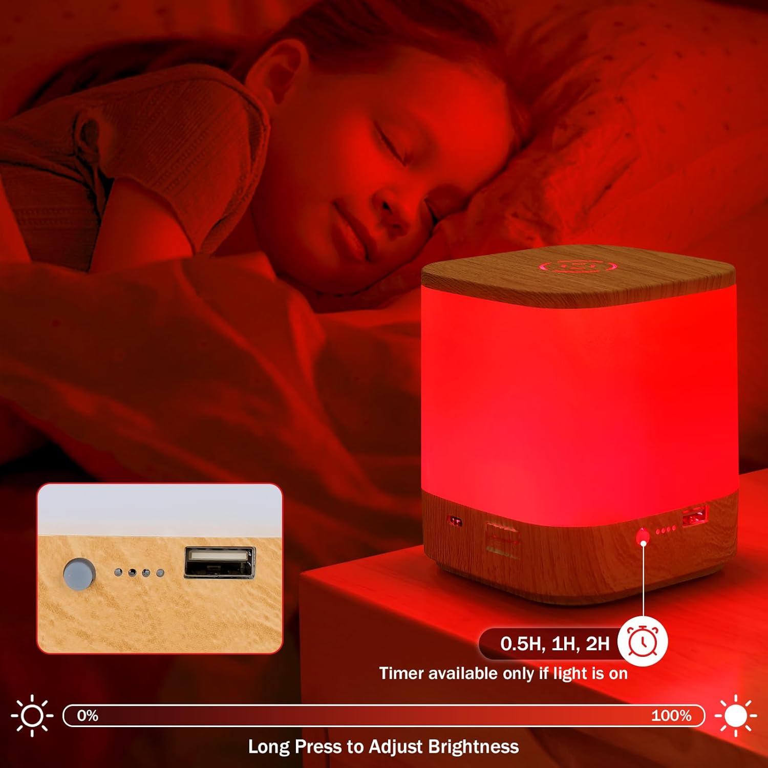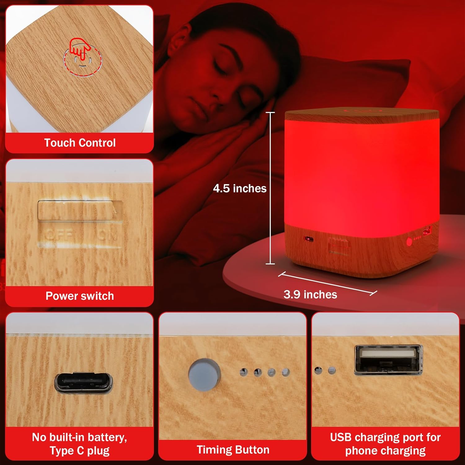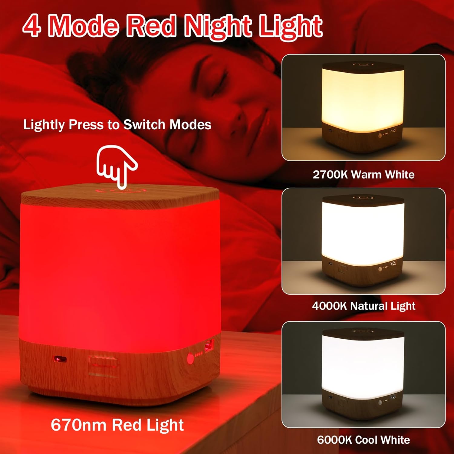 • 4 Modes Red Nightlight: The top circular area is the touch effective area, Single tap touch on the effective area can switch between 4 lighting modes: 670nm red light, 2700K warm white light, 4000K natural white light, and 6000K cool white light. This product has no built-in battery and does not provide a power adapter. We provide a Type C Power cord and have a built-in USB port for charging the phone.