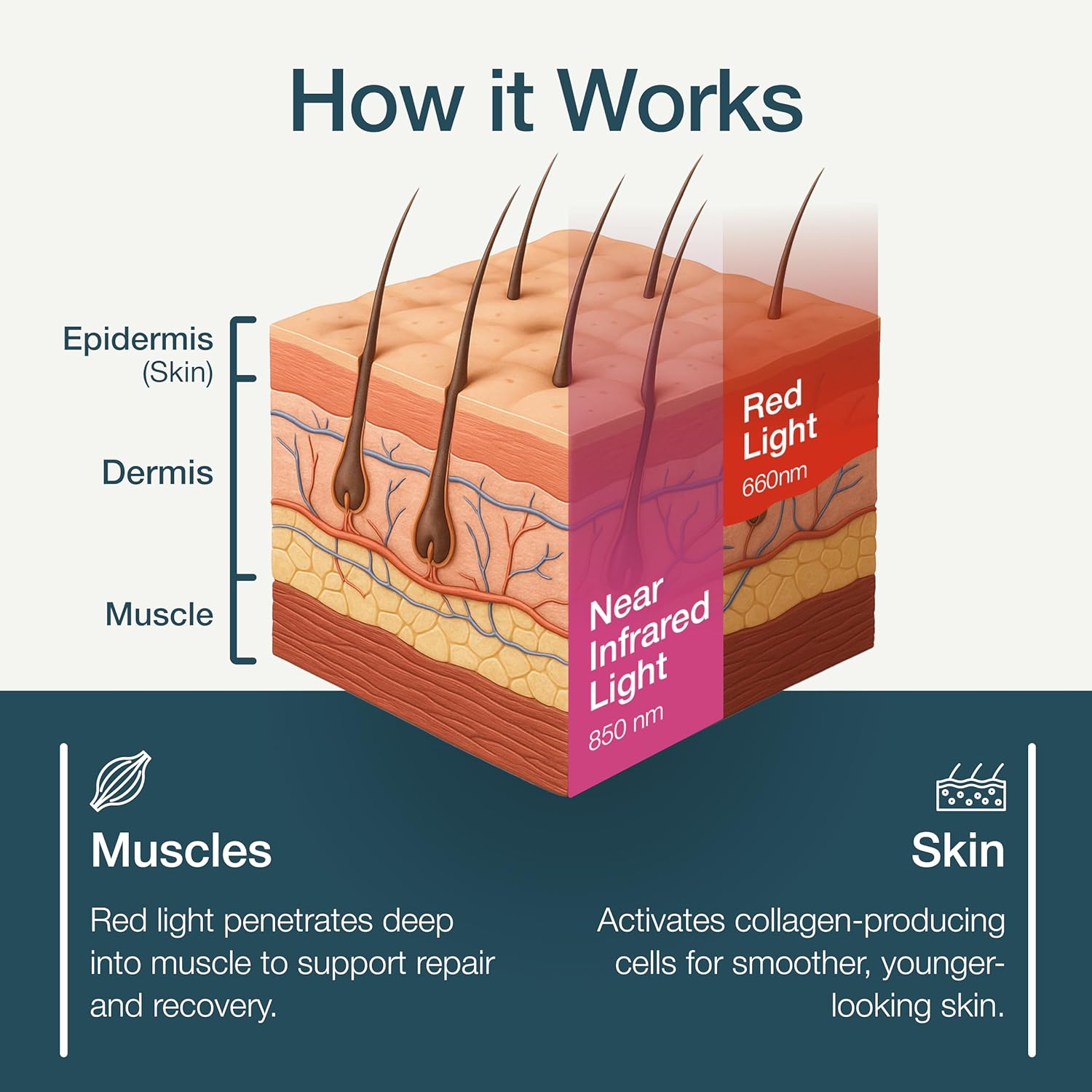 • Helps Reduce Fine Lines & Recover Muscles: Clinically proven wavelengths (660 nm red & 850 nm near-infrared) help smooth fine lines, improve skin elasticity, and support faster muscle recovery and performance.