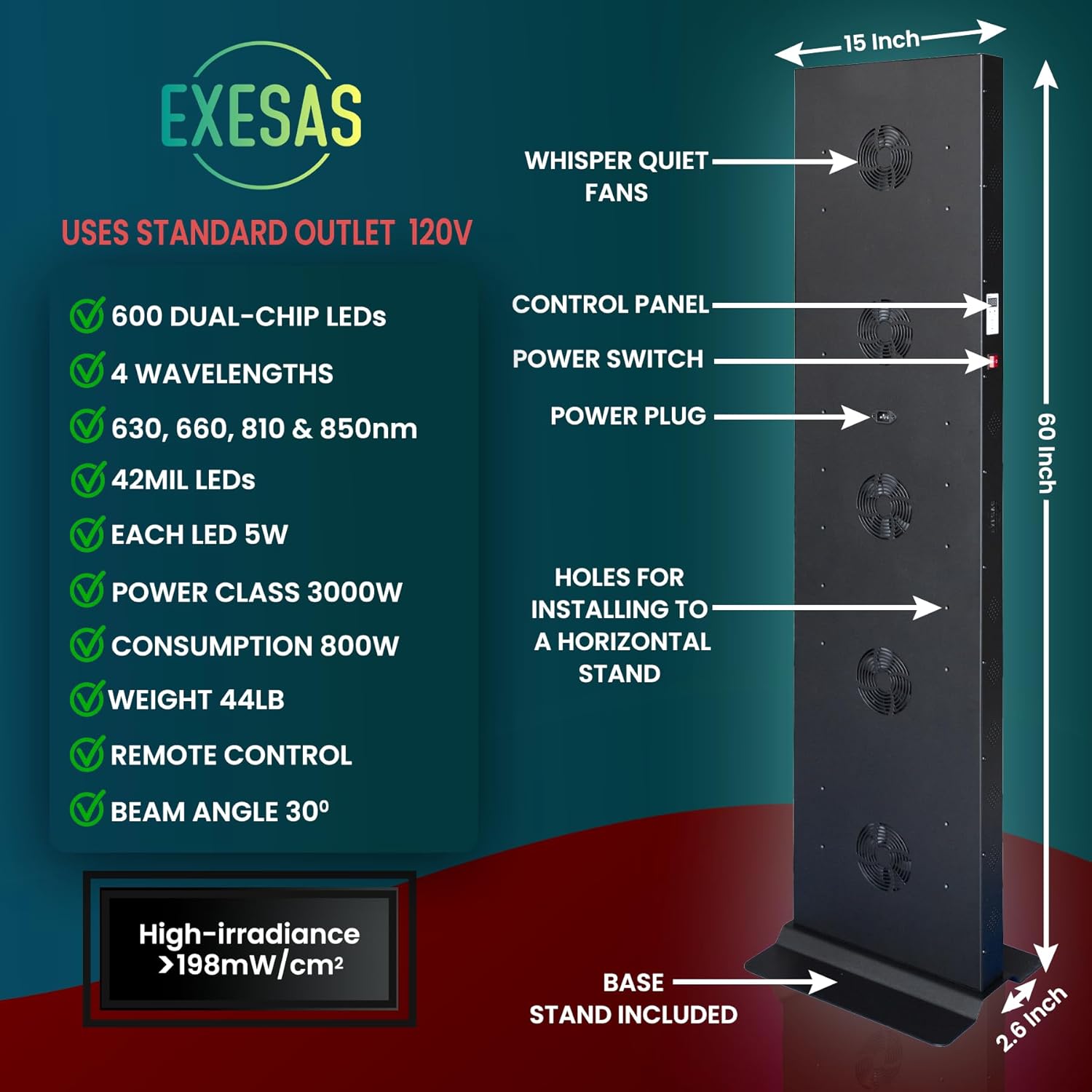 • MANUAL & ACCESSORIES: Our package features everything you need for optimal use, including a top-notch LED panel (60″ X 15″ X 2.6″), a sleek remote control for effortless navigation, sunglasses, a user manual for easy setup and operation, and a sturdy base stand for secure placement. The LED panel is equipped with a built-in timer for precise session control, an LCD control panel, and integrated cooling fans to efficiently dissipate heat, ensuring prolonged device performance and user comfort.