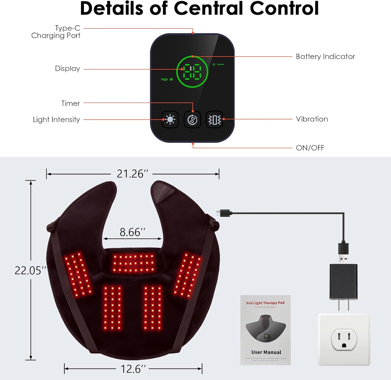 - Rechargeable & User-Friendly Controller: Designed for on-the-go use with no cords to hold you back, the control box provides up to 400 minutes of use on a full charge. red light therapy for neck’s simple button interface makes it easy to operate, even while charging. For optimal performance and safety, please use the included charging cable and adapter