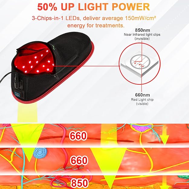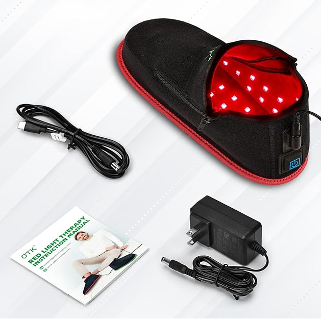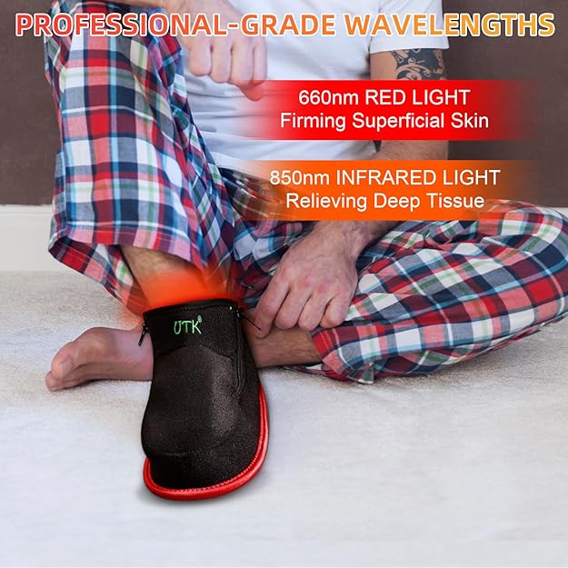 - Benefits of Professional-Grade Red Light: The UTK red light shoe feature a total of 78 LED bulbs, utilizing a 3-in-1 technology. Each LED bulb includes 2*660nm red light (visible) and 1*850nm infrared light (invisible). The 660nm red light primarily affecting the skin surface and subcutaneous tissue 1-2 centimeters deep. It can promote skin health and accelerate wound healing. The 850nm infrared light energy can reach deeper structures, it helps relieve deep pain and promotes deep tissue repair